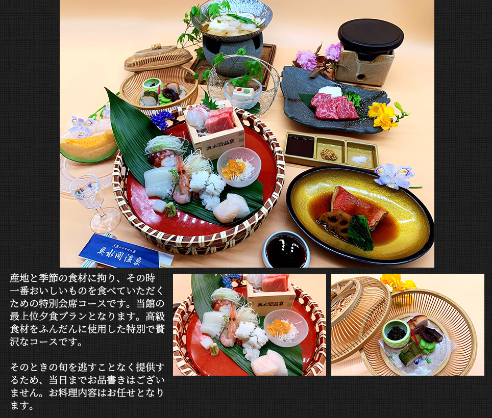 四季折々の旬の素材や地元産の野菜を用い、季節を描いて御膳をはんなり彩る、「奥水間温泉」の会席料理。